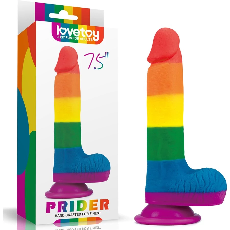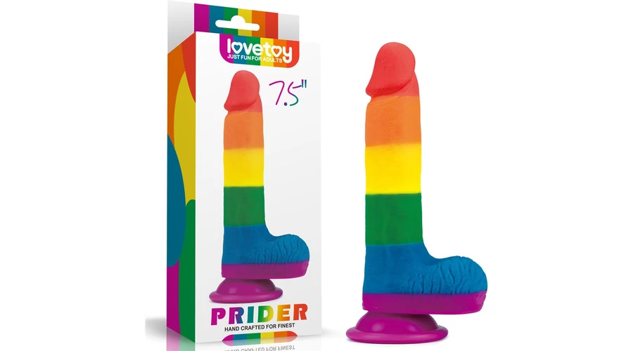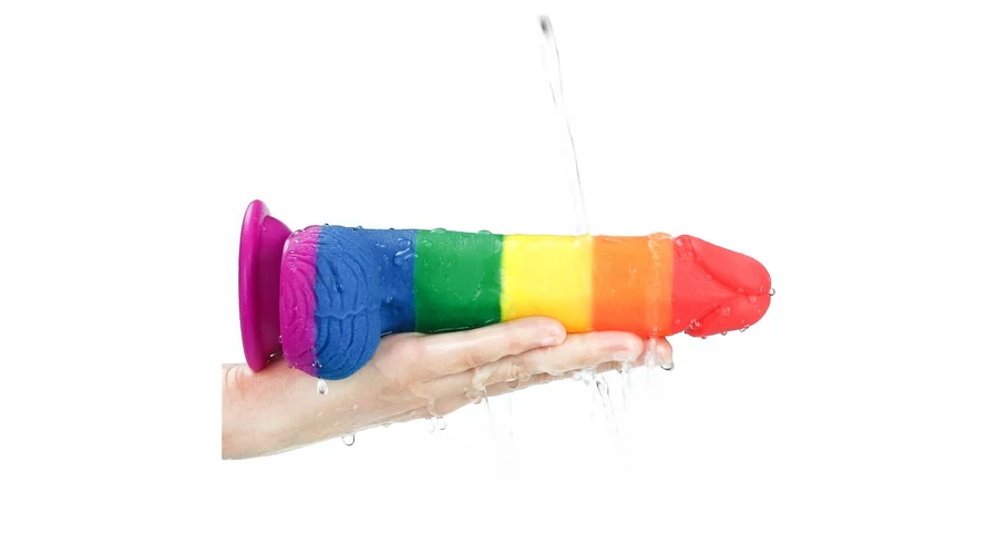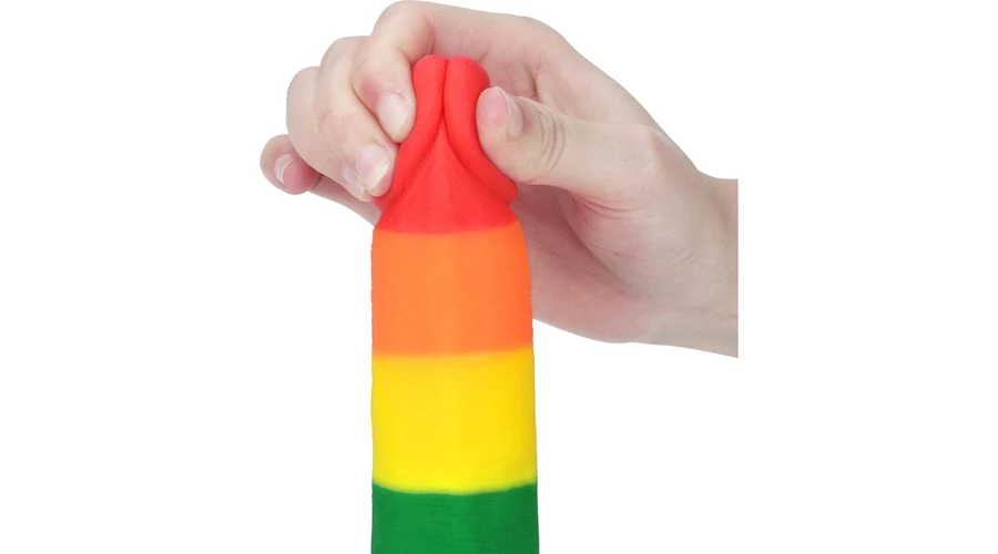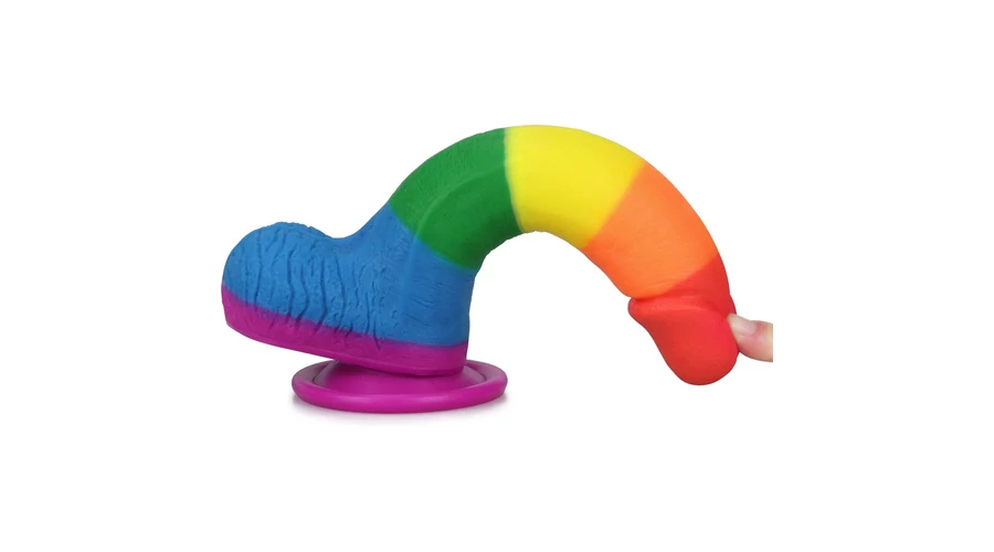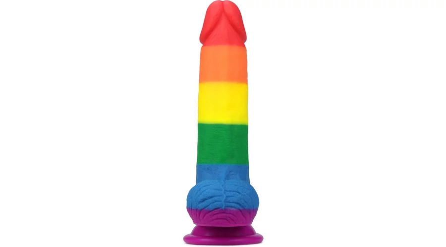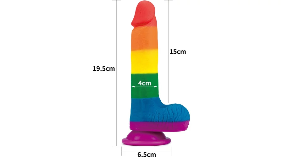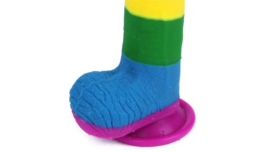 Szivárvány színű, pénisz formájú, kiváló minőségű szilikonból készített, erezett felületű, herékkel kiegészített, flexibilis, motor nélküli dildó. Tapadókorongja segítségével sík felületen rögzíthető.