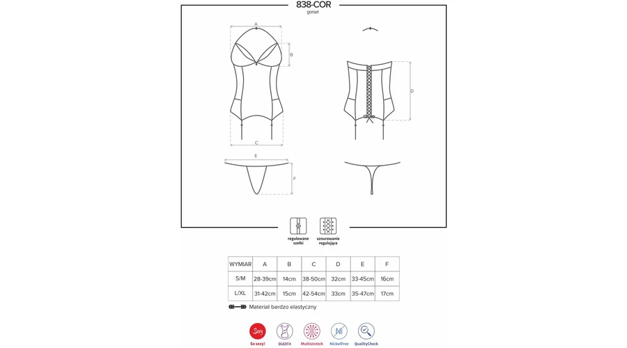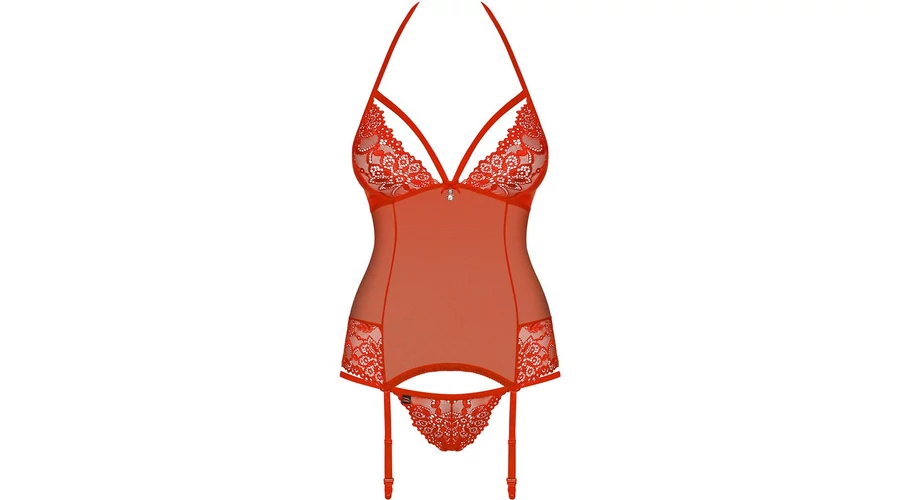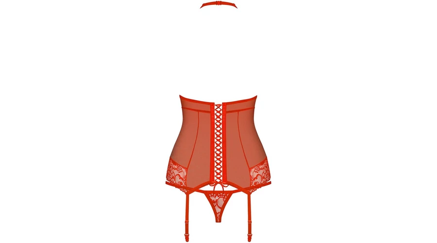 Állítható vállpántos, levehető harisnyatartóval kiegészített fűző, tangával. A harisnya nem része a csomagnak.