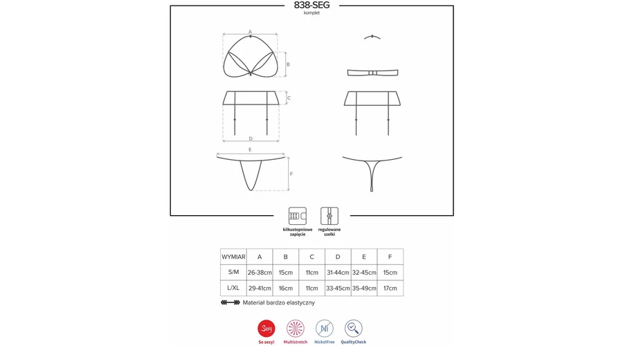 Elegáns, fényes kövekkel díszített, csipkés fehérnemű szett, mely melltartóból, tangából és harisnyatartóból áll. A harisnya nem része a csomagnak.