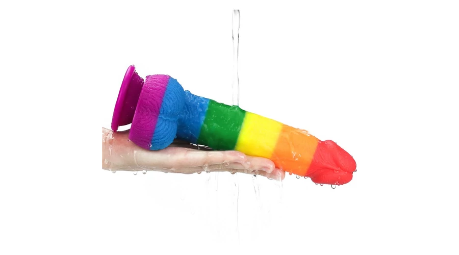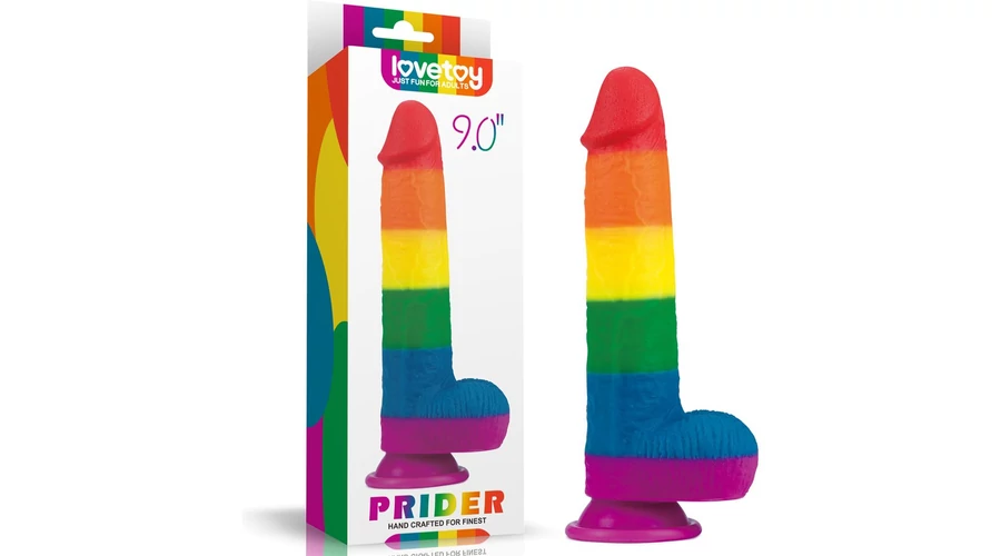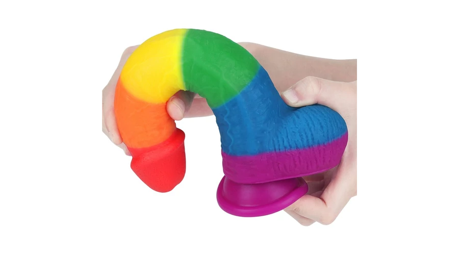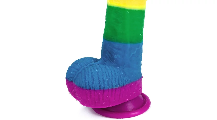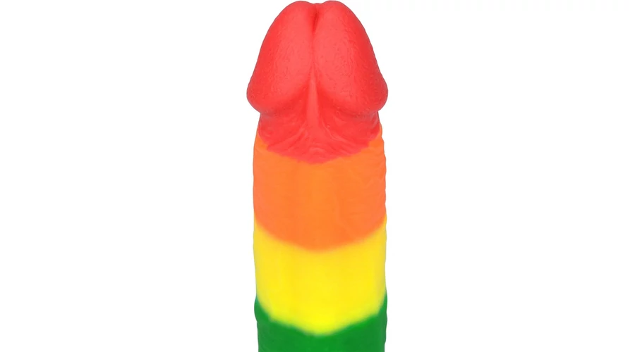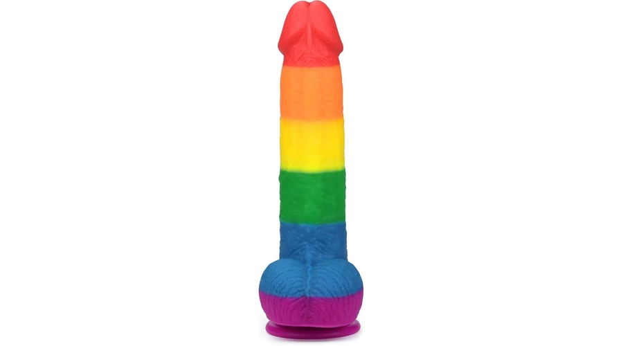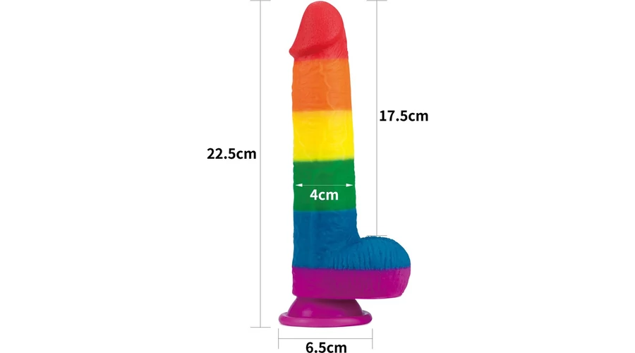 Szivárvány színű, pénisz formájú, kiváló minőségű szilikonból készített, erezett felületű, herékkel kiegészített, flexibilis, motor nélküli dildó. Tapadókorongja segítségével sík felületen rögzíthető.