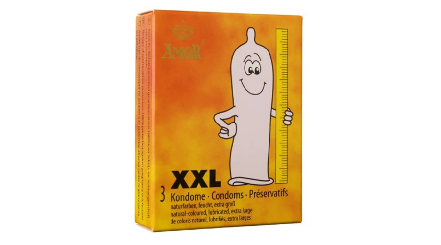 Minőségi AMOR nagyméretű (19 cm hosszú), sikosított felszínű óvszer, 3 darabos kiszerelésben.