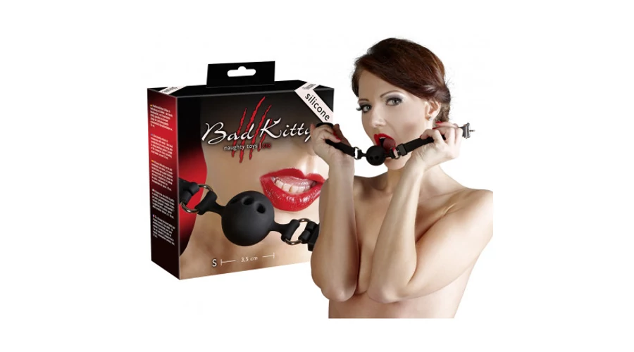 Szilikon szájpecek légzőnyílásokkal, fém csattal állítható fejpánttal. A golyó átmérője 3,5cm.