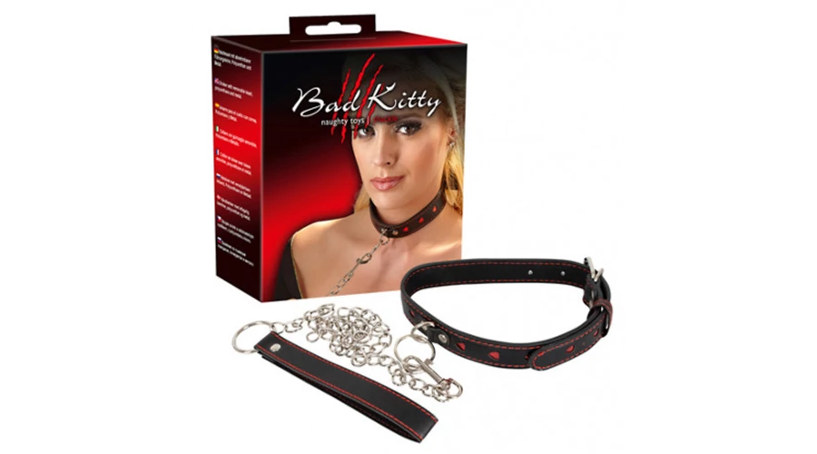 Bad Kitty - szíves nyakörv, fém pórázzal (fekete-piros)