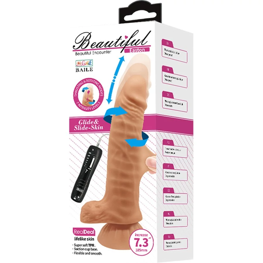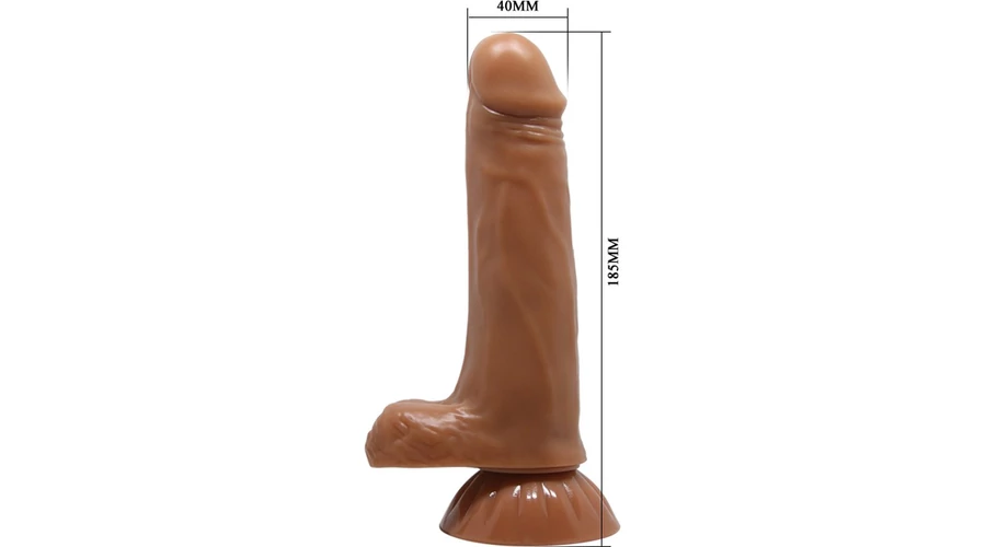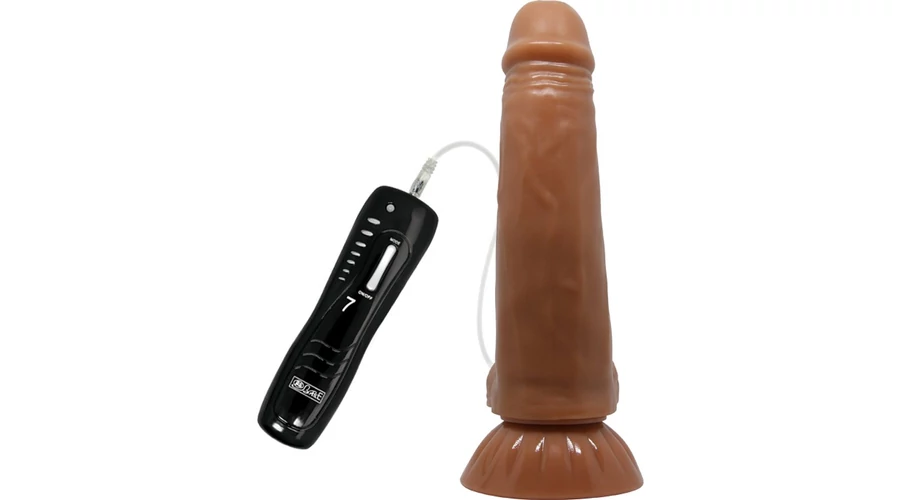 Realisztikus kialakítású, testszövethez hasonló, bőrszerű tapintású anyagból készült, 7 toló és 7 forgási funkcióval rendelkező, vezetékes távirányítóval szabályozható, erezett felületű, herékkel kiegészített vibrátor.