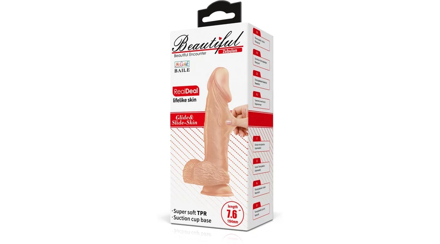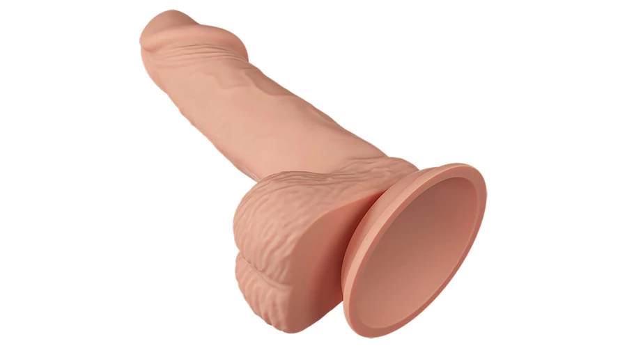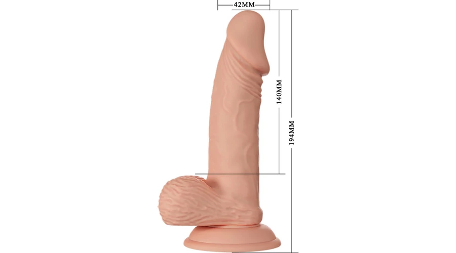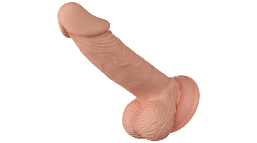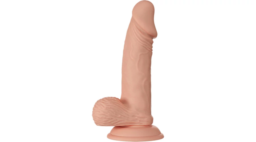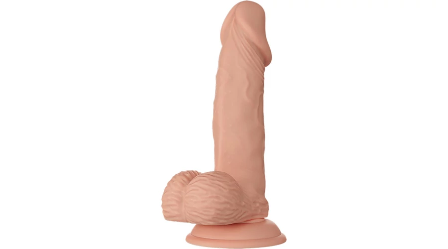 motor nélküli, erezett felületű, herékkel kiegészített dildó. Tapadókorongja