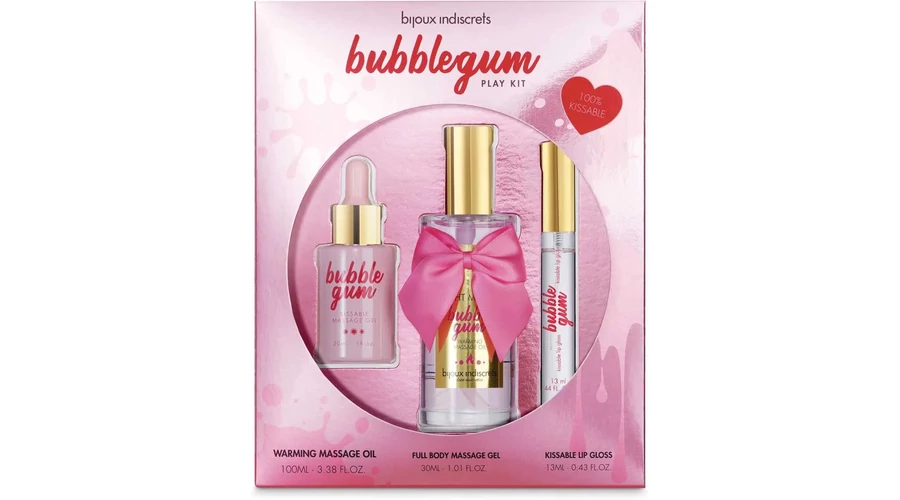 BUBBLEGUM Play Kit:- melegítő masszázs olaj 100 ml- ehető testzselé 30ml- orális ajakfény 13ml