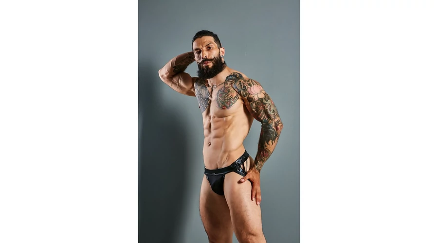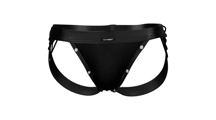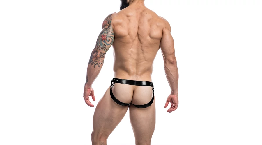 C4M-Desire Jockstrap-fekete Leatherette-férfi tanga pántokkal M