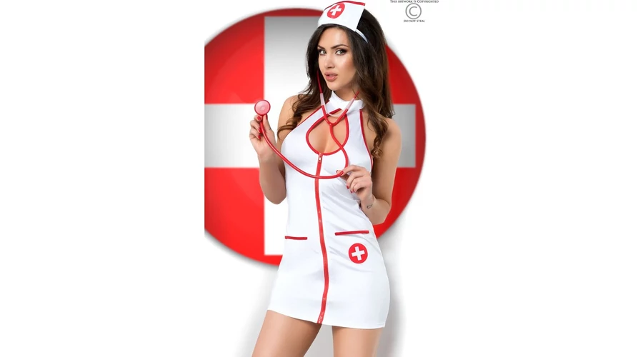 Szexi nővér jelmez, amelyhez tanga, sztetoszkóp, térdzokni és fityula is tartozik.