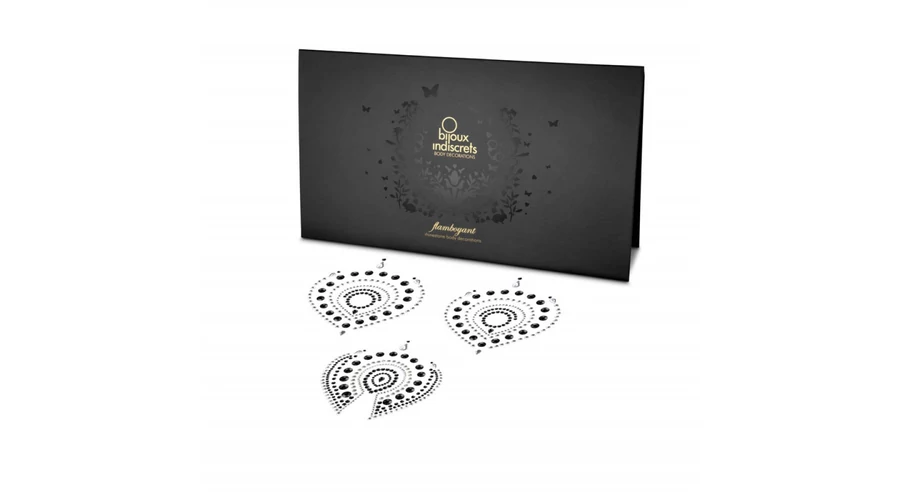 Felragasztható díszek (többször is felhasználhatóak. 2db a mellbimbókra és 1db a szeméremrész köré, változatos szín és formavilággal. A mellbimbódíszek átmérője 5,5-6cm, belső átmérőjük pedig kb. 1,5cm. A szeméremdísz 7-7,5cm széles és 9,5cm hosszú.