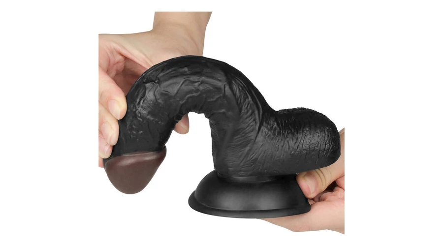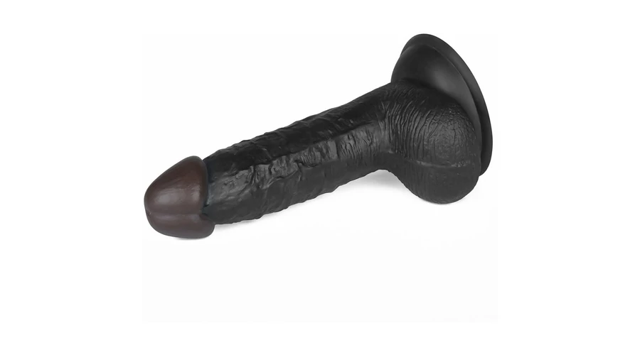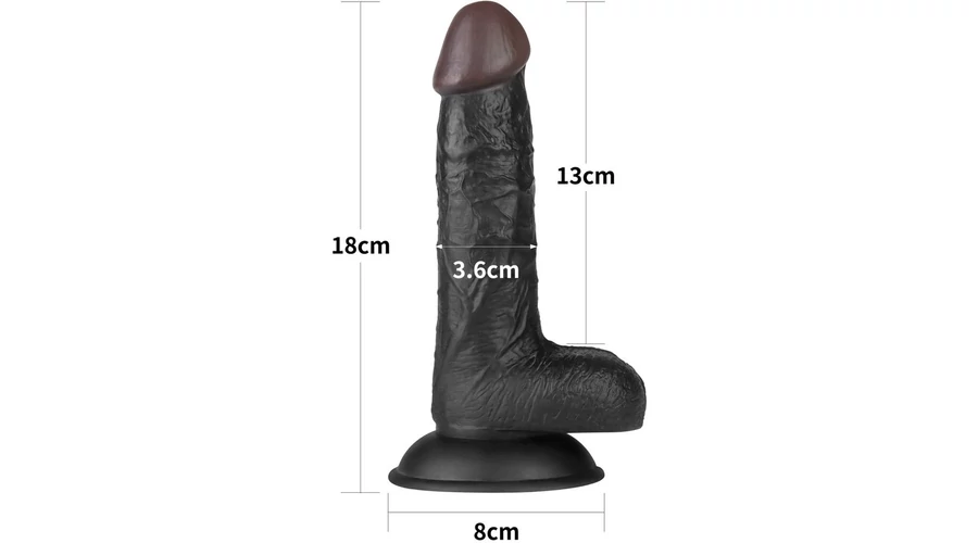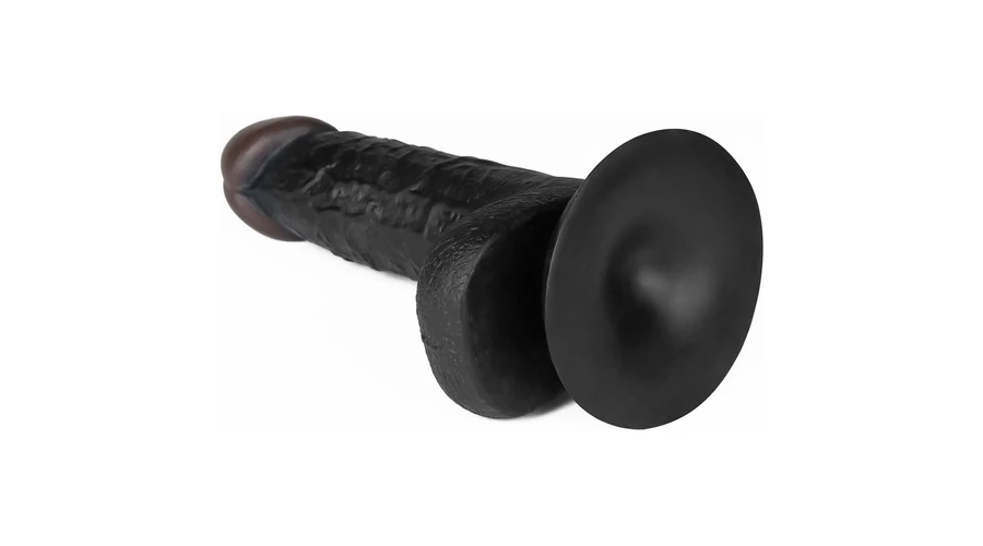 kialakítású, puha, rugalmas, erezett felületű, herékkel kiegészített dildó,