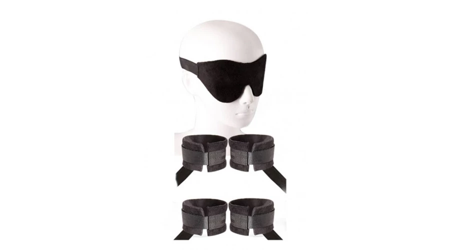 A szett tartalma: szemmaszk, 2 csuklókötöző, 2 bokakötöző