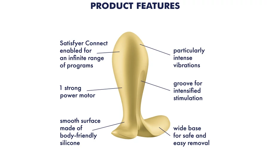 Prémium minőségű, bőrbarát anyagból készített, okostelefonról is irányítható, ergonómiailag kialakított, halk működésű uniszex fenékdugó a díjnyertes Satisfyer Connect alkalmazással. 12 rezgési móddal rendelkezik, melyek a fenékdugó egész területén érezhetőek. Az applikáció segítségével egyedi funkciókat lehet alkotni, akár zenei ritmusból (pl. Spotify), saját vagy párunk hangjából vagy környezeti zajokból is, amelyeket meg is lehet osztani másokkal. Biztonságos video chat kapcsolatot is kezdeményezhet, így akár partnere is irányíthatja az eszközt, miközben láthatják is egymást. Természetesen applikáció nélkül is használható a hagyományos módon, kezdőknek is ajánlott.