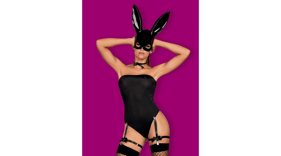 Csodálatos nyuszilány jelmez, melynek tartalma egy rugalmas, szaténos anyagból készült pánt nélküli body, két harisnyatartós, méretre állítható combpánt, egy rugalmas pánttal ellátott nyuszifül, egy nyakpánt és egy pár necc combfix.
