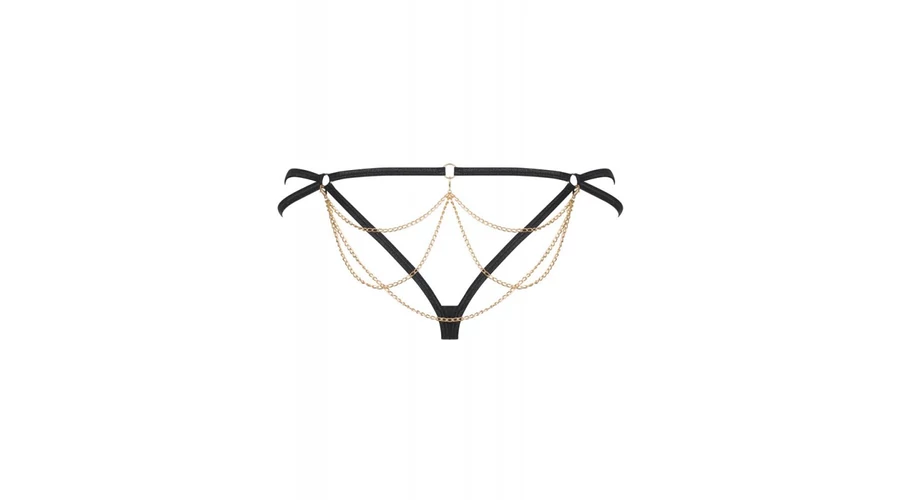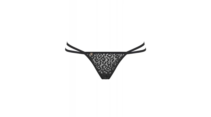 Áttesztő anyagból készített, leopárdmintás, a fenékrészen finom lánccal díszetett tanga. A csomag a melldíszeket nem tartalmazza.