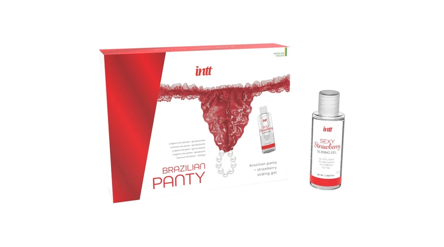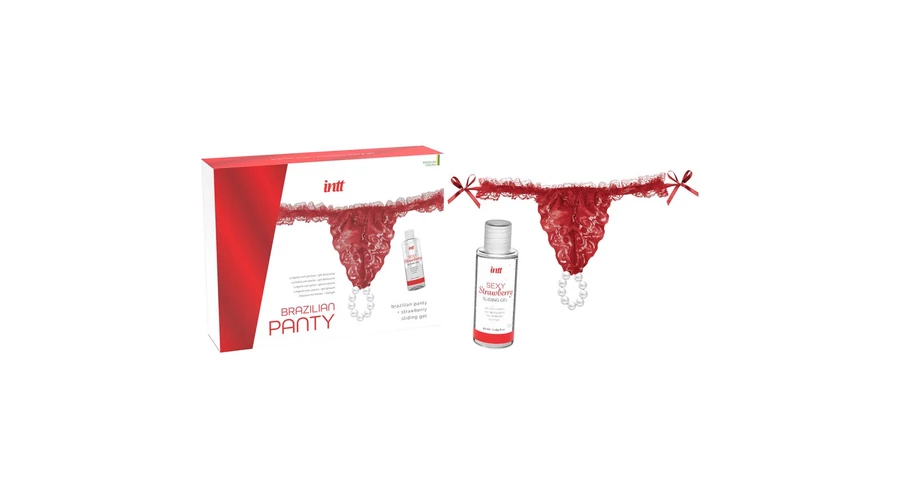A brazil bugyi egy finom csipke fehérnemű, egyedi gyöngysorral, amely feldobja és stimulálja az intim pillanatokat. A csomag tartalmaz egy 50 ml-es eperillatú vízbázisú síkosítót is.