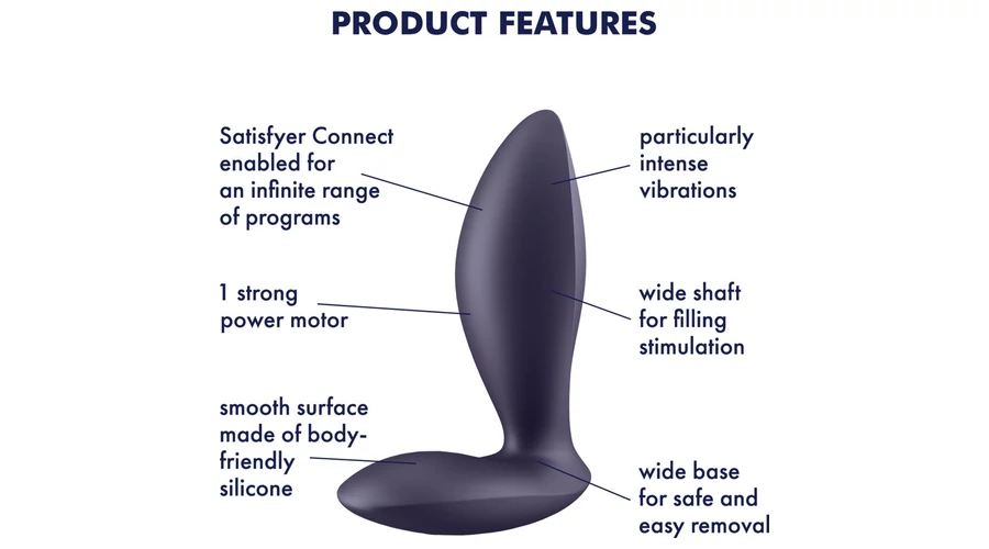 Prémium minőségű, bőrbarát anyagból készített, okostelefonról is irányítható, ergonómiailag kialakított, uniszex fenékdugó a díjnyertes Satisfyer Connect alkalmazással. 12 rezgési móddal rendelkezik, de az applikáció segítségével egyedi funkciókat lehet alkotni, akár zenei ritmusból (pl. Spotify), saját vagy párunk hangjából vagy környezeti zajokból is, amelyeket meg is lehet osztani másokkal. Biztonságos video chat kapcsolatot is kezdeményezhet, így akár partnere is irányíthatja az eszközt, miközben láthatják is egymást. A talp kialakítása meggátolja az esetleges becsúszás lehetőségét. Természetesen applikáció nélkül is használható a hagyományos módon, kezdőknek is ajánlott.