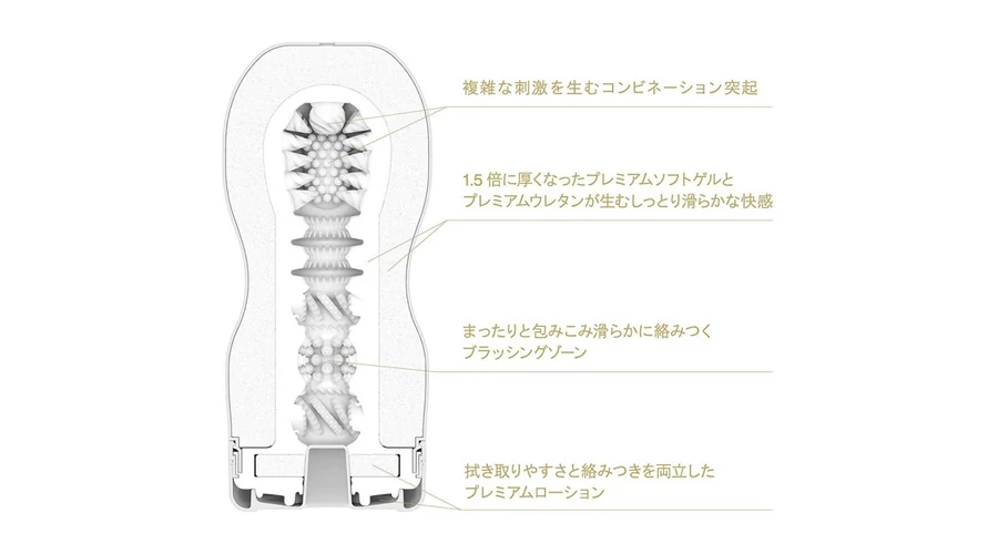 A TENGA híres CUP sorozatának prémium változatai az eredetinél 1,5x vastagabb belső elasztomerhüvellyel rendelkeznek.