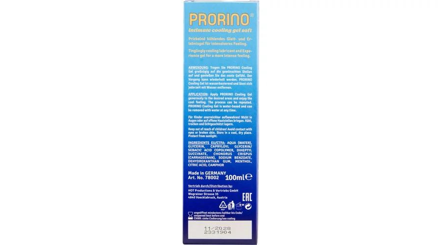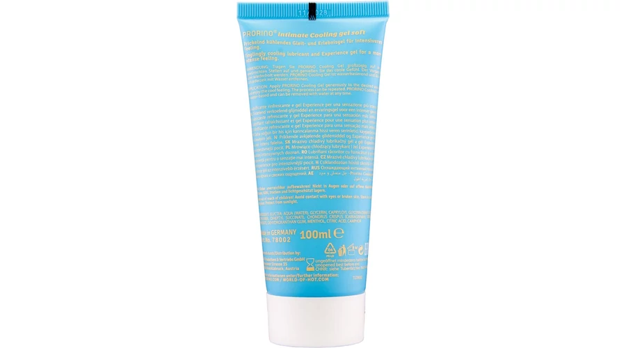 Bizsergető, lágyan hűsítő síkosító az intenzívebb érzésért. A síkosító összetétele vízben oldódó, ezért vízzel könnyen lemosható. Színezékmentes, és még az izgalmas pillanatok alatt sem hagy nyomot. Selymes állaga kellemes érzést biztosít a bőrön és nem ragad. A tökéletes siklási tulajdonságok és az optimális hozam teszi a PRORINO hűsítő gélt tökéletes társsá a szeretkezéshez. Mentolt tartalmaz.