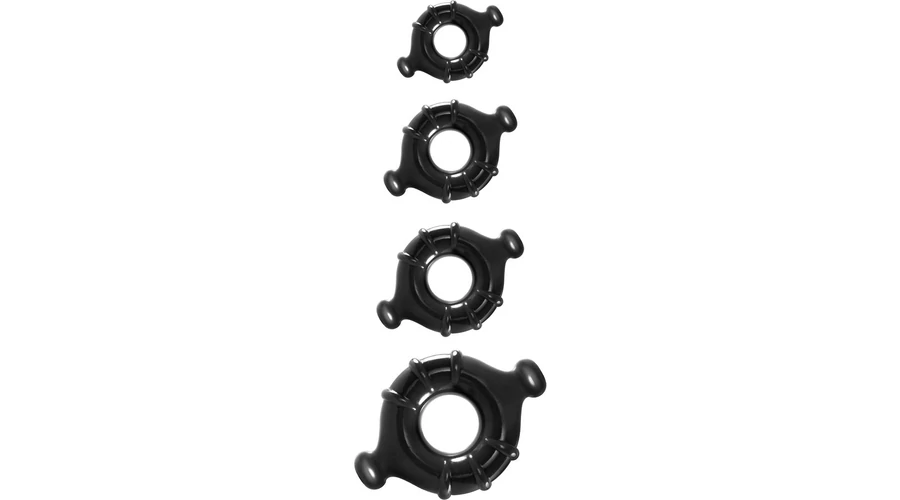 Férfiaknak ajánlott, péniszre helyezhető, 4 darabból álló erotikus készlet, mely elősegíti merevedés fenntartását viselője számára. Kialakítása révén behatolás közben a hüvely izom idegvégződéseinek stimulálására is tökéletesen alkalmas. A négy gyűrű eltérő méretű.