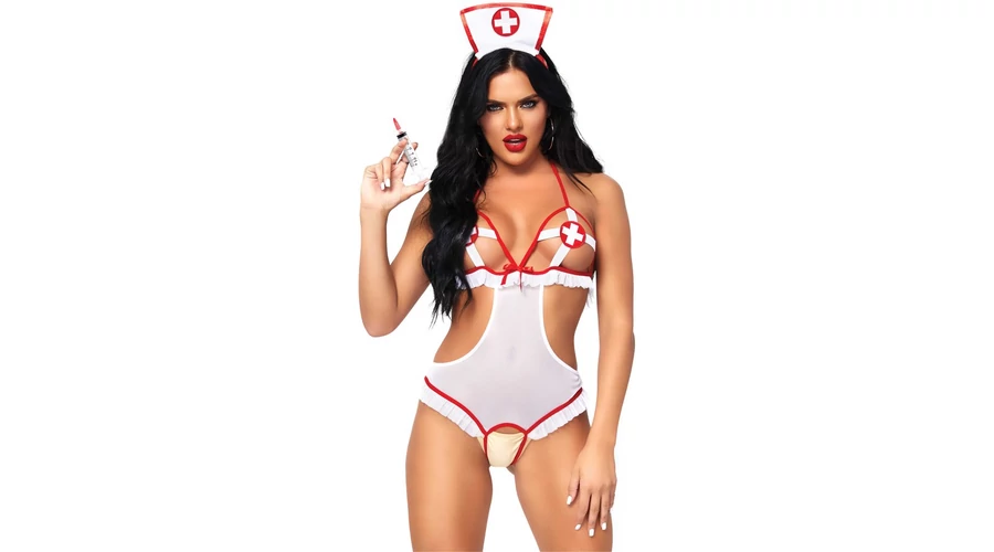 Nővér jelmez, amely egy alul nyitott, melltartó nélküli body-ból és egy fejpántból áll.