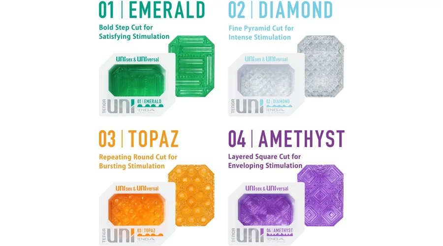 Az UNI lehet az ujjaid által történő stimuláció kiegészítője, vagy kifordítva, mint egy izgató, nyújtható hüvely, az igazán uniszex élményért. A TENGA UNI minden nemű és irányultságú ember számára elérhető és élvezetes, és a TENGA UNI duplán élvezetes, ha valaki mással együtt használja! Minden UNI egyedi textúrával rendelkezik, amely alkalmas a különböző játéktípusokhoz, így a maximális élvezet érdekében masszírozza, szorítsa, nyújtsa és dörzsölje. Higiénikus, egyszer használatos és eldobható. A csomagban mind a négy UNI termék megtalálható.