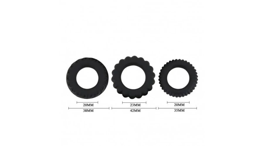 Férfiaknak ajánlott, péniszre helyezhető, 3 darabból álló erotikus készlet, mely elősegíti merevedés fenntartását viselője számára. Kialakítása révén behatolás közben a hüvely izom idegvégződéseinek stimulálására is tökéletesen alkalmas.