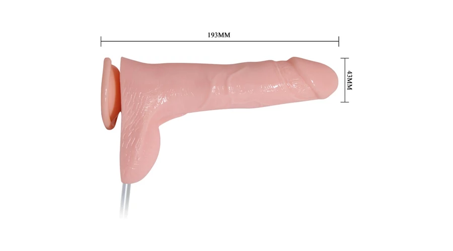 Realisztikus kialakítású, flexibilis, bőrszerű tapintású anyagból készült, állítható rezgéserősségű, távirányítós, erezett felületű, herékkel kiegészített vibrátor. Tapadókorongja segítségével sík felületre rögzíthető.Pumpa segítségével folyadék kibocsátására is alkalmas. ( meleg víz, hígított intim tisztítószer, vagy hígított vízbázisú sikosító)